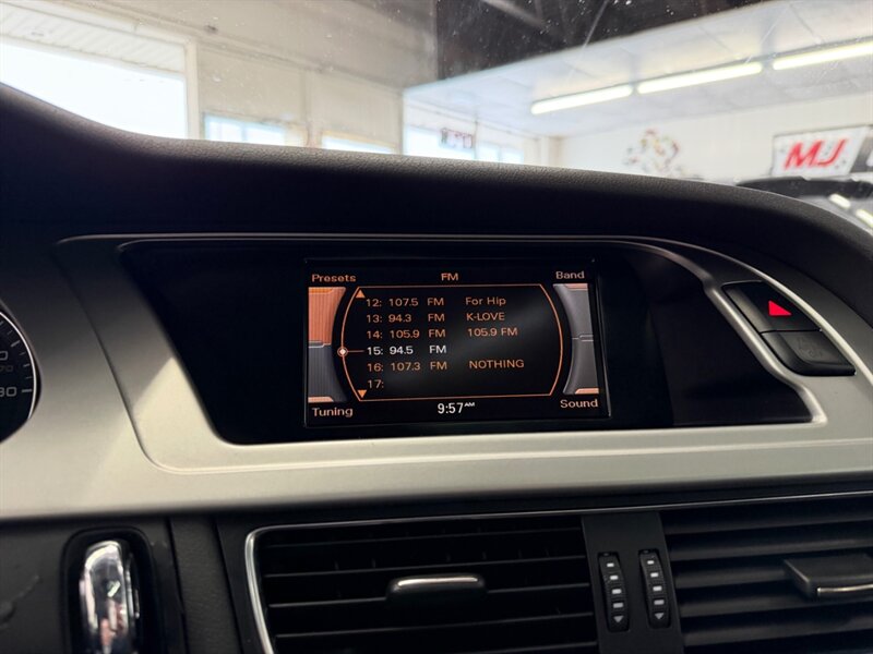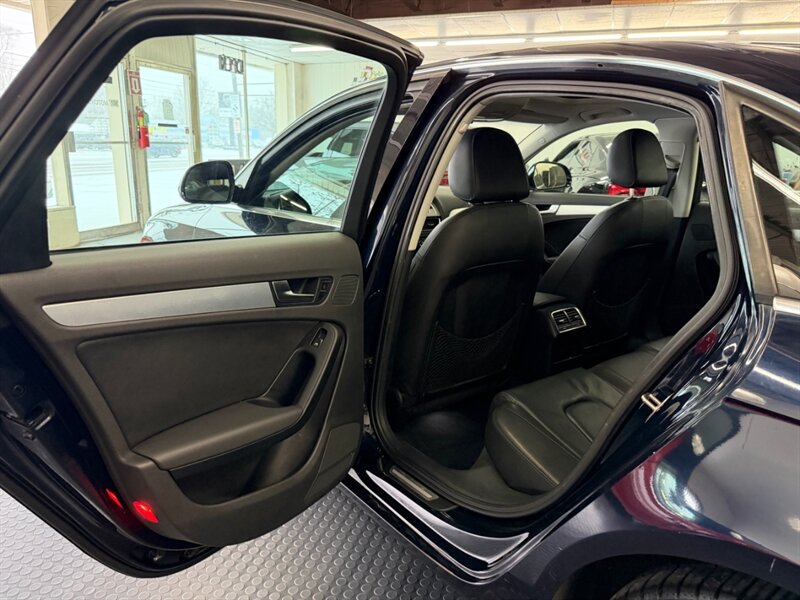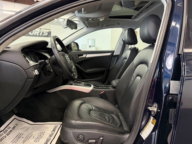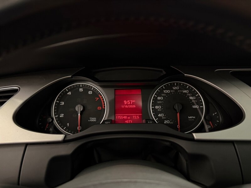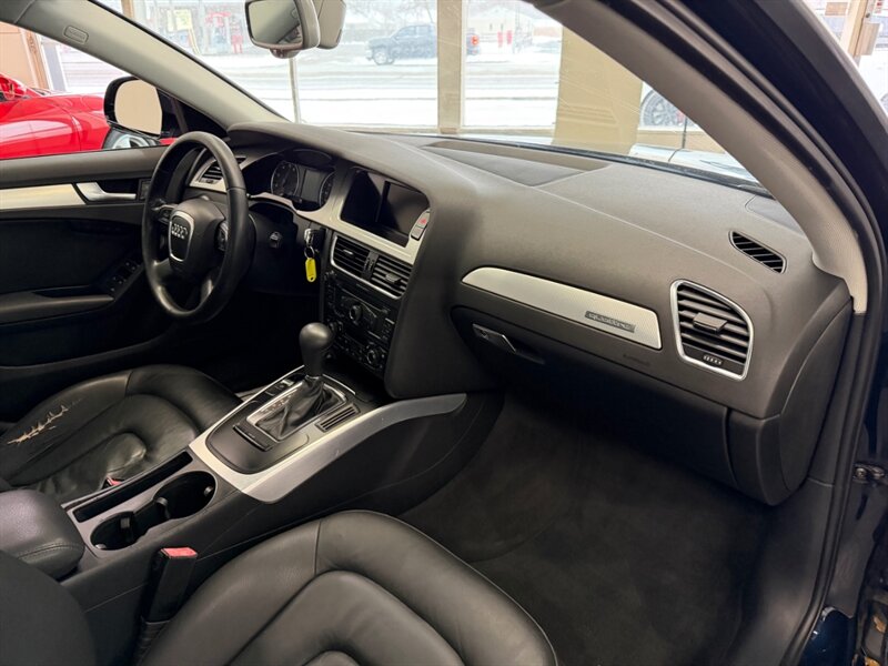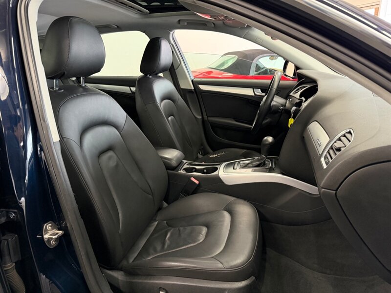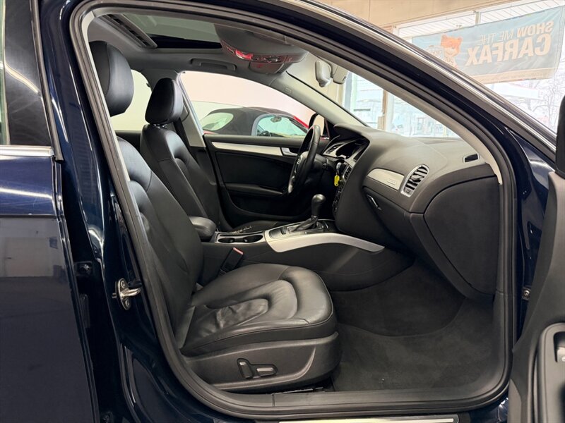 2009 Audi A4 2.0T quattro Premium Plus — Deep Sea Blue Pearl Effect exterior with Black leather interior. Powered by a 2.0L Turbo I4 (211 hp / 258 lb-ft) and equipped with Audi quattro all-wheel drive, this A4 delivers approximately 21 MPG city and 27 MPG highway. Factory equipment includes leather seating surfaces with heated, power-adjustable front seats and driver memory, dual-zone automatic climate control, power tilt/slide sunroof, Xenon HID headlights with automatic on/off, rain-sensing wipers, alloy wheels, cruise control, steering-wheel audio controls, premium audio with AM/FM/CD and auxiliary input (Bluetooth phone/audio capability equipped on many Premium Plus models), power windows/locks/mirrors, and full safety features (front, side and curtain airbags, ABS, traction and stability control, tire pressure monitoring). Vehicle has under 176,000 miles (averaging less than 10,000 miles per year), is in excellent overall condition, and has a clean CARFAX.