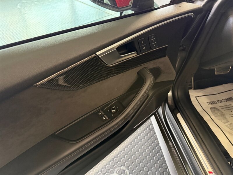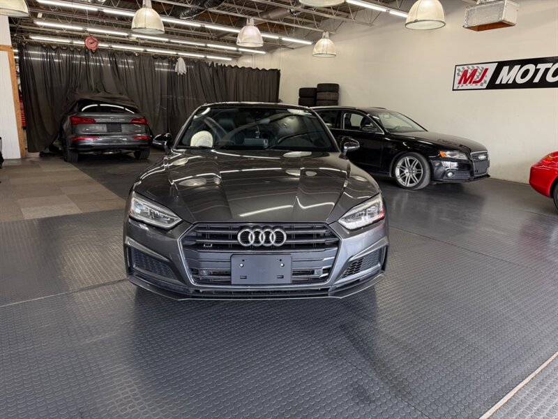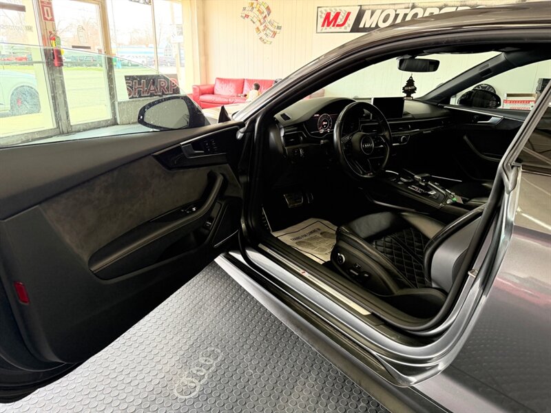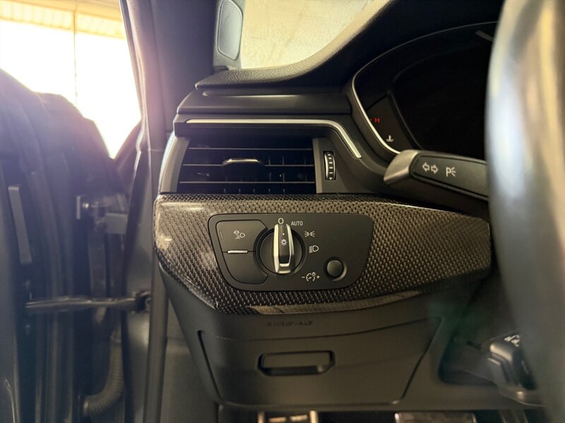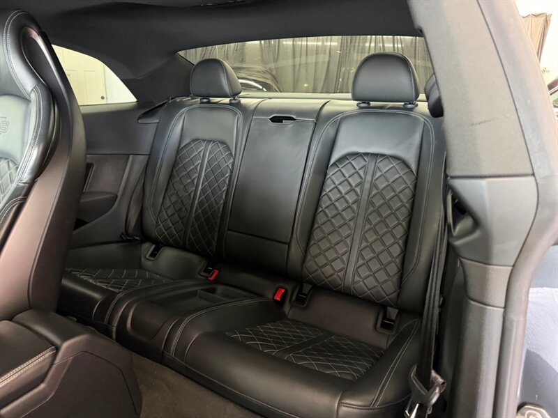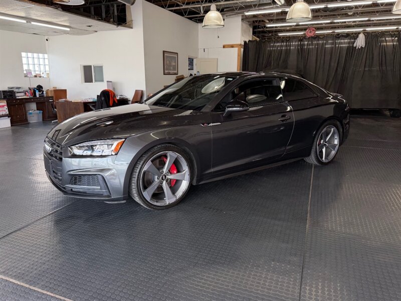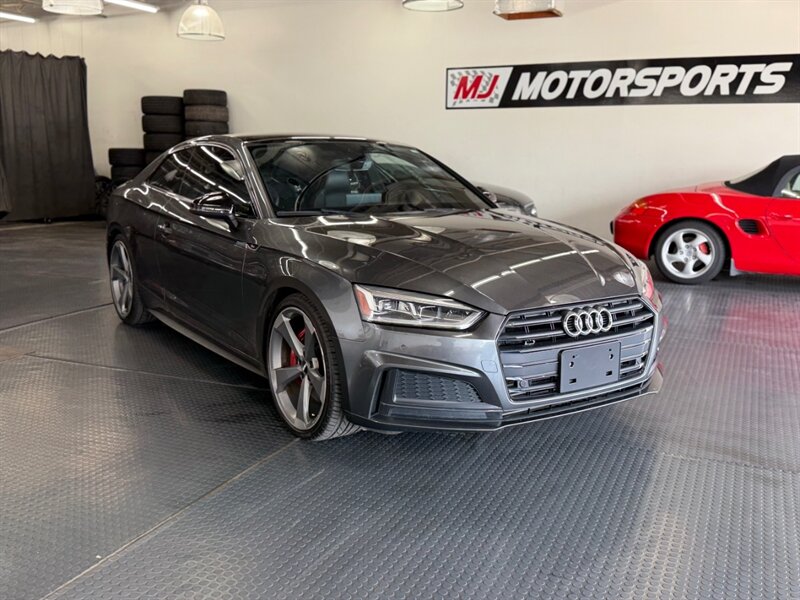 2019 Audi S5 3.0T quattro Premium Plus — powered by a 3.0L turbo V6 producing 349 hp and 369 lb-ft, paired with Audi’s quattro all-wheel-drive system and an 8-speed automatic transmission. Factory features include full leather seating, power-adjustable heated front seats with memory, dual-zone automatic climate control, LED headlights and taillights, power heated mirrors, keyless start/entry, rearview camera with front/rear parking sensors, integrated MMI infotainment with navigation, Bluetooth/USB connectivity and smartphone integration, and a suite of active safety systems such as Audi pre sense. This example also adds the Black Optic and S Sport packages plus optional Bang & Olufsen 3D sound and Carbon Atlas interior inlays. Daytona Gray Pearl Effect exterior over a Black leather interior, rated 21 MPG city / 30 MPG highway, and in excellent overall condition.