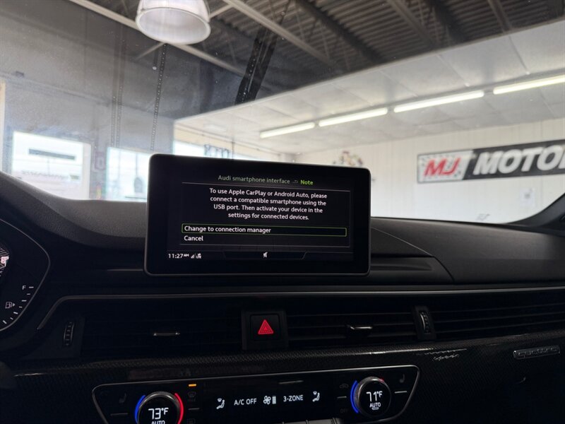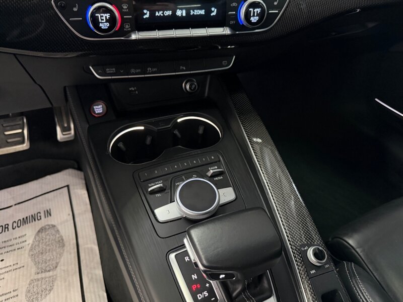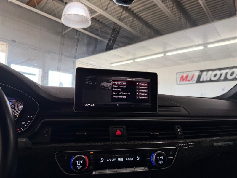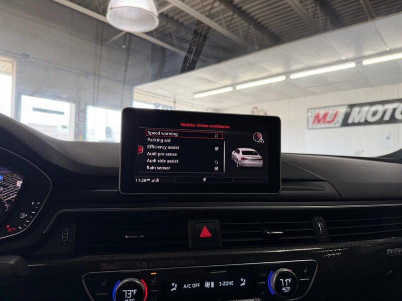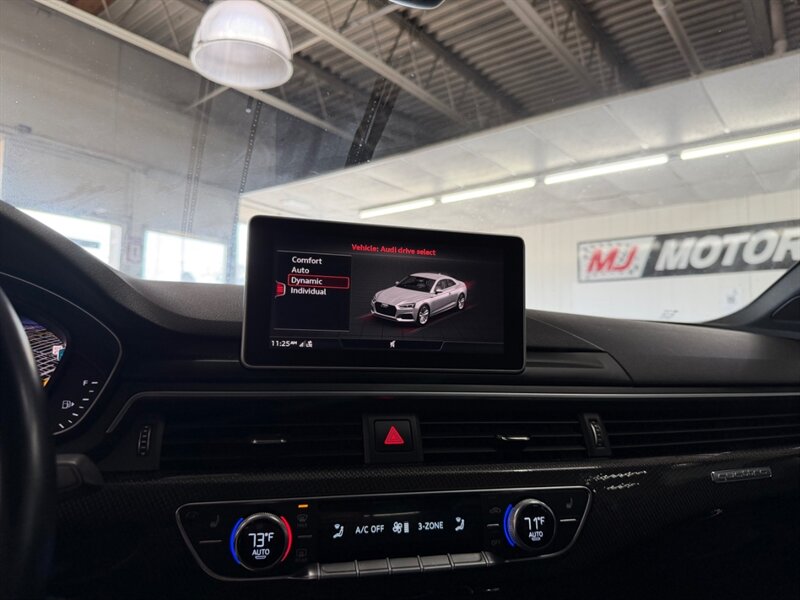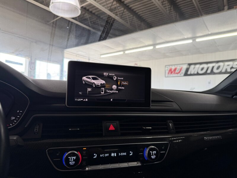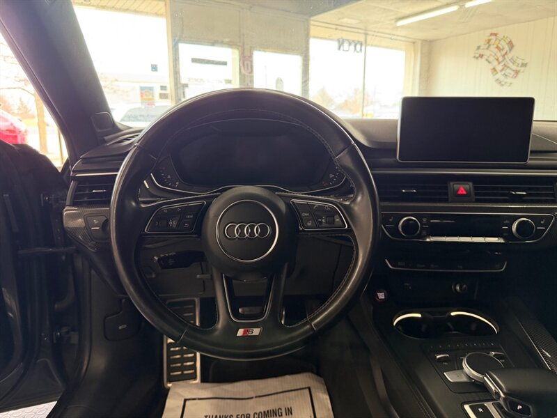 2019 Audi S5 3.0T quattro Premium Plus — powered by a 3.0L turbo V6 producing 349 hp and 369 lb-ft, paired with Audi’s quattro all-wheel-drive system and an 8-speed automatic transmission. Factory features include full leather seating, power-adjustable heated front seats with memory, dual-zone automatic climate control, LED headlights and taillights, power heated mirrors, keyless start/entry, rearview camera with front/rear parking sensors, integrated MMI infotainment with navigation, Bluetooth/USB connectivity and smartphone integration, and a suite of active safety systems such as Audi pre sense. This example also adds the Black Optic and S Sport packages plus optional Bang & Olufsen 3D sound and Carbon Atlas interior inlays. Daytona Gray Pearl Effect exterior over a Black leather interior, rated 21 MPG city / 30 MPG highway, and in excellent overall condition.