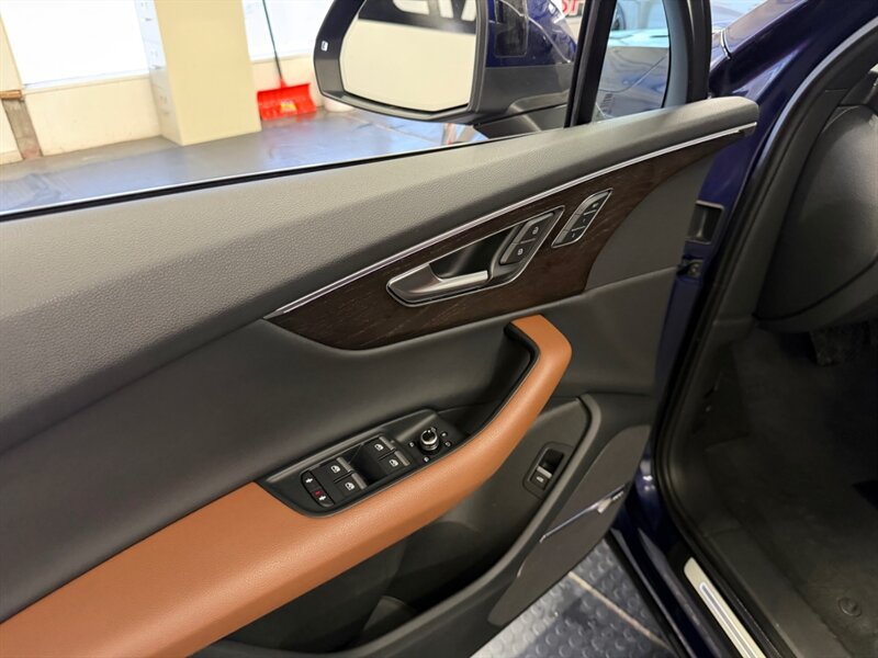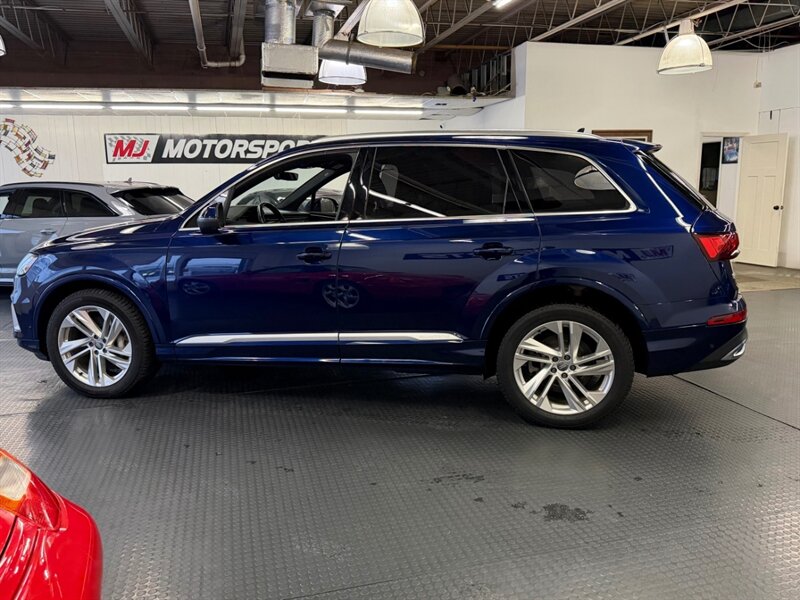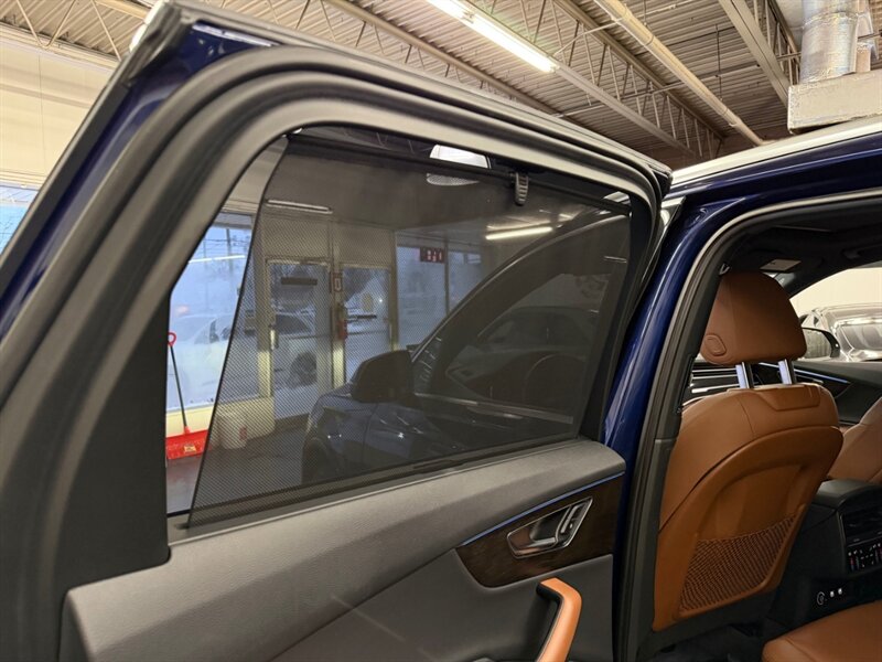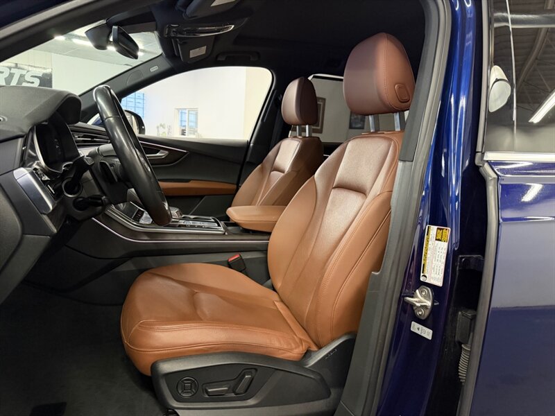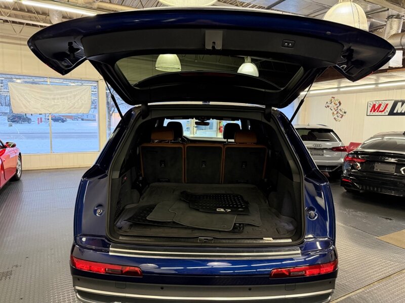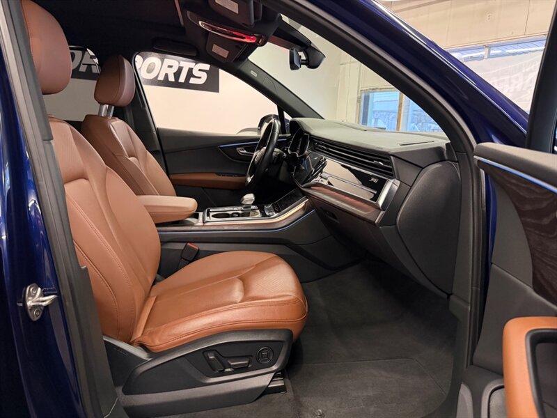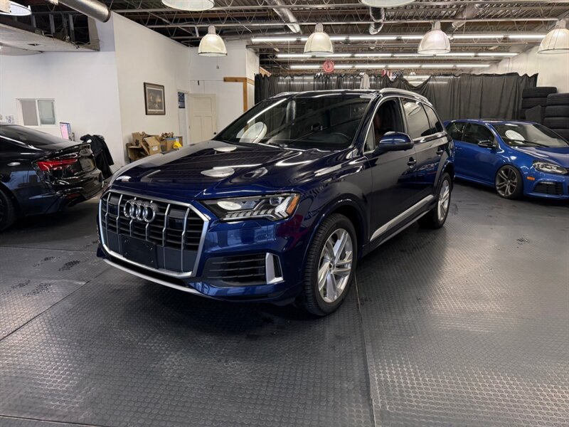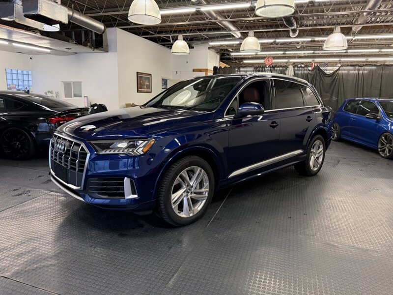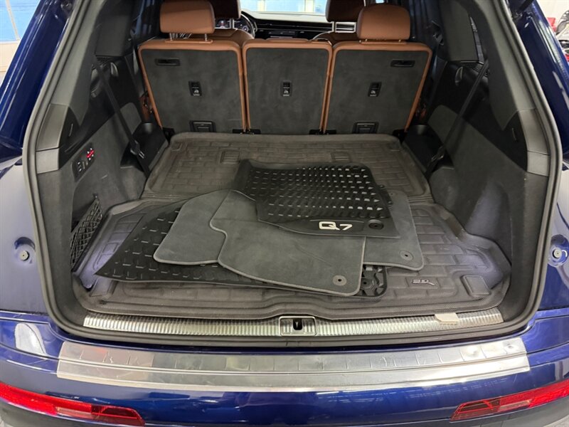 2020 Audi Q7 quattro Prestige 55 TFSI finished in Navarra Blue Metallic with Okapi Brown leather, powered by a 3.0L mild-hybrid e-turbo V6 (335 hp, 369 lb-ft). Factory equipment includes quattro all-wheel drive with eight-speed Tiptronic transmission, adaptive air suspension with selectable drive modes, LED headlights, panoramic sunroof and power tailgate, keyless entry and push-button start, heated and ventilated power front seats with memory and heated rear seats, four-zone automatic climate control, Audi virtual cockpit digital instrument cluster, MMI navigation with smartphone integration (Apple CarPlay/Android Auto), Bang & Olufsen premium audio, multiple USB ports and Bluetooth, plus comprehensive driver aids such as adaptive cruise control, lane-keeping assist, blind-spot monitoring, rear cross-traffic alert, parking sensors with surround-view camera and Audi pre-sense safety systems. Cold Weather Package is fitted; optional Audi Guard all-weather floor mats and black cloth headliner are included. Vehicle is in excellent overall condition.