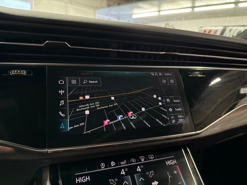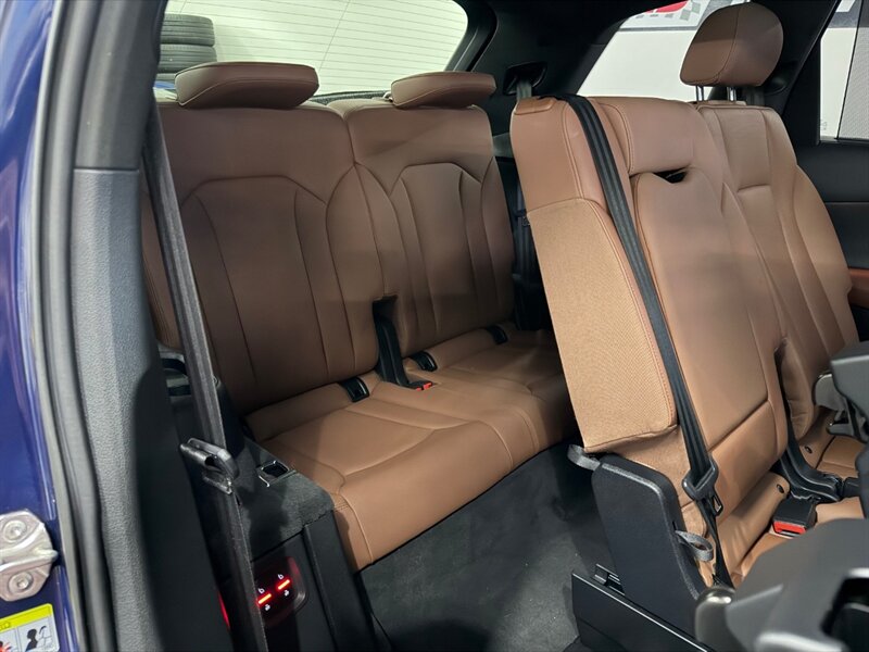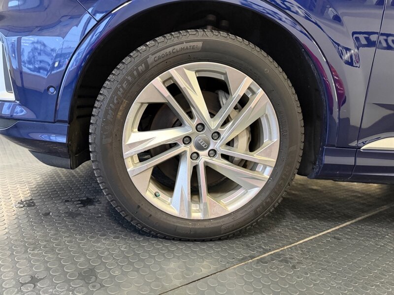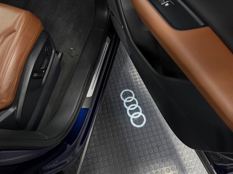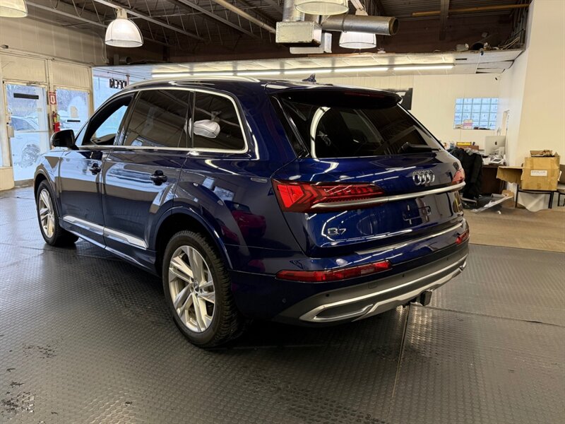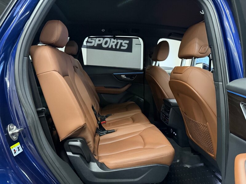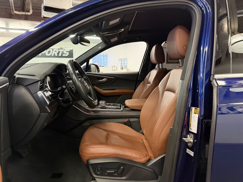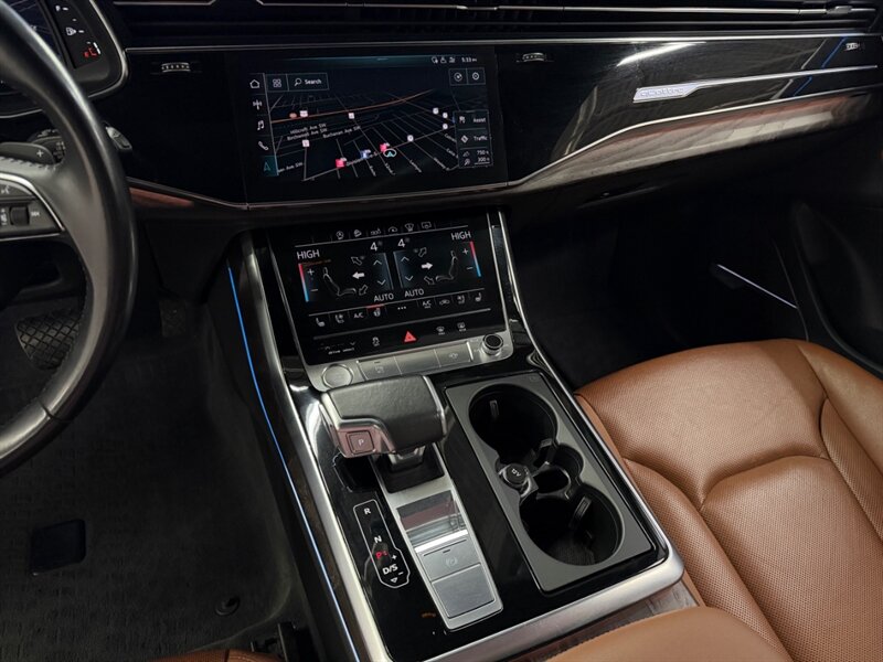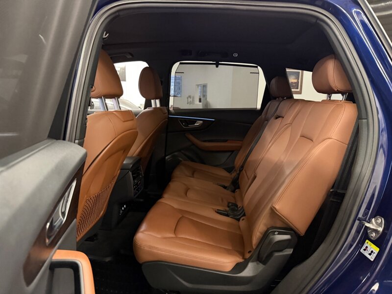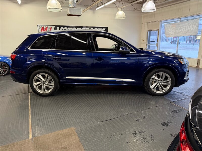 2020 Audi Q7 quattro Prestige 55 TFSI finished in Navarra Blue Metallic with Okapi Brown leather, powered by a 3.0L mild-hybrid e-turbo V6 (335 hp, 369 lb-ft). Factory equipment includes quattro all-wheel drive with eight-speed Tiptronic transmission, adaptive air suspension with selectable drive modes, LED headlights, panoramic sunroof and power tailgate, keyless entry and push-button start, heated and ventilated power front seats with memory and heated rear seats, four-zone automatic climate control, Audi virtual cockpit digital instrument cluster, MMI navigation with smartphone integration (Apple CarPlay/Android Auto), Bang & Olufsen premium audio, multiple USB ports and Bluetooth, plus comprehensive driver aids such as adaptive cruise control, lane-keeping assist, blind-spot monitoring, rear cross-traffic alert, parking sensors with surround-view camera and Audi pre-sense safety systems. Cold Weather Package is fitted; optional Audi Guard all-weather floor mats and black cloth headliner are included. Vehicle is in excellent overall condition.