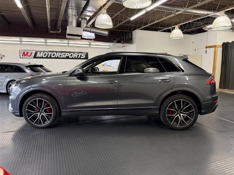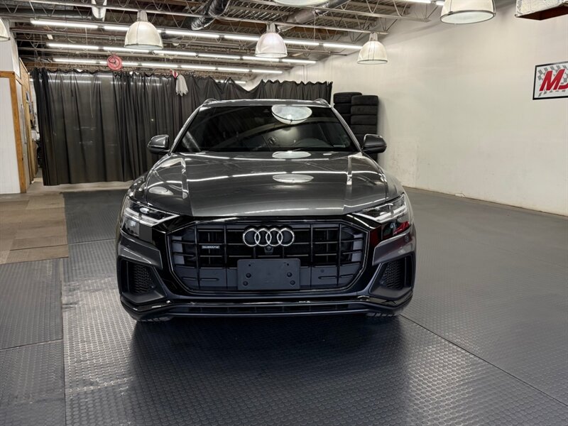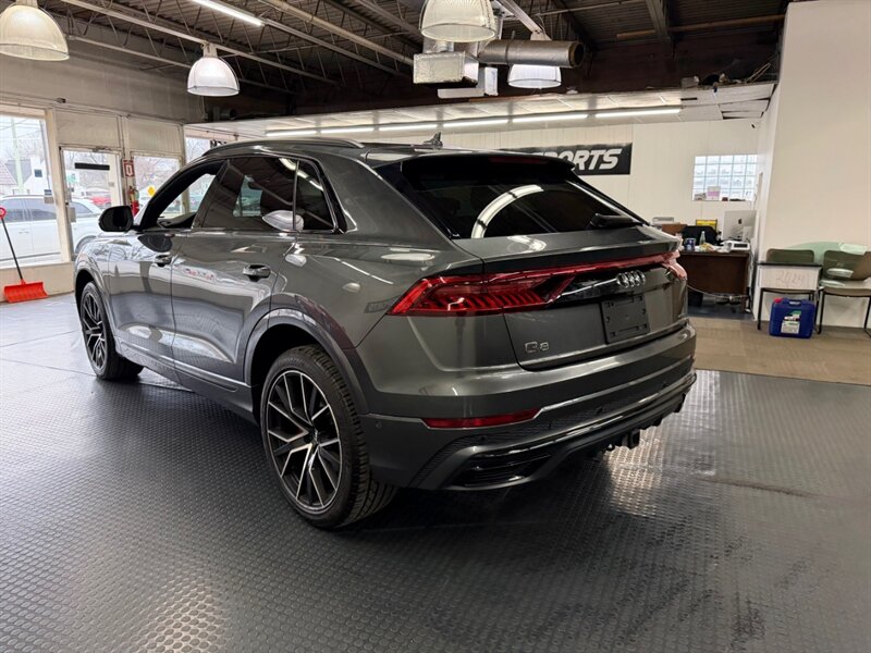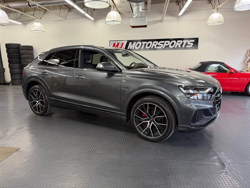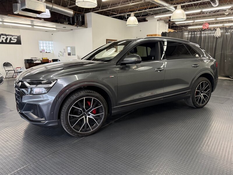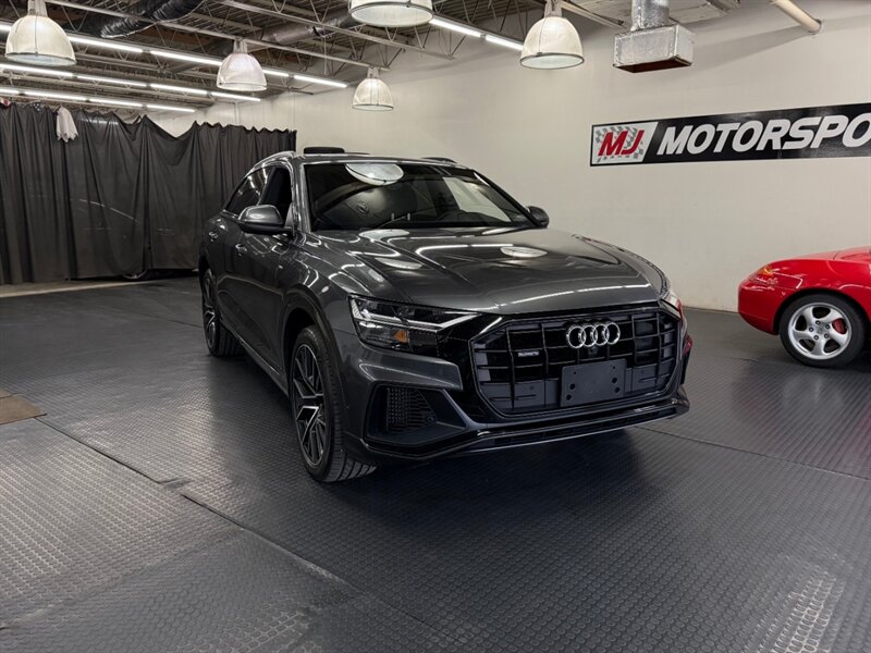 2020 Audi Q8 quattro Premium Plus 55 T in Samurai Gray Metallic with Black leather interior and Rock Gray stitching. Powered by a 3.0L mild-hybrid e-turbo V6 producing 335 hp and 369 lb-ft, paired with quattro all-wheel drive and an automatic transmission. Includes Cold Weather Package, S line Plus Package, S line Style Package, plus Black Cloth Headliner and Towing Package.