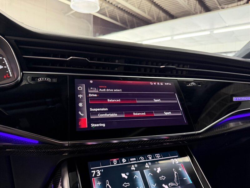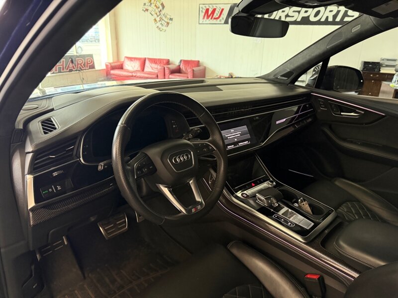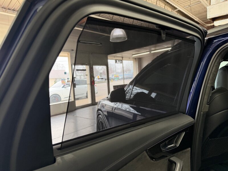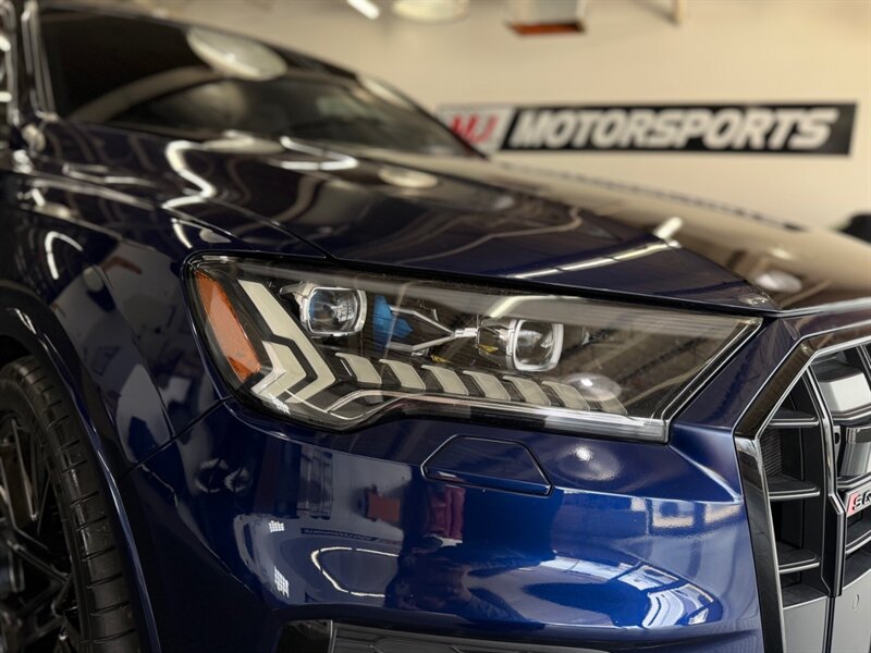 2021 Audi SQ7 4.0T quattro Prestige — Navarra Blue Metallic with Black w/ Rock Gray stitching Alcantara/premium leather interior — powered by a 4.0L twin-turbo V8 producing 500 hp and 568 lb-ft; EPA 15 MPG city / 21 MPG highway. This example is in excellent overall condition, clean CARFAX and one owner, and includes the Black Optic, Luxury and S Sport packages plus Bang & Olufsen Advanced 3D Sound, Carbon Fiber Mirror Caps, Audi S Beam, Laser Headlights Package and Night Vision Assistant. Factory-standard equipment includes quattro all-wheel drive mated to an 8-speed Tiptronic automatic, adaptive air suspension with Audi drive select, Audi virtual cockpit and MMI Navigation Plus with touch response, Apple CarPlay/Android Auto and Bluetooth, power-adjustable heated front seats with memory and premium upholstery, panoramic sunroof, power liftgate, multi-zone climate control, LED lighting, parking sensors and rearview camera, adaptive cruise and lane-assist systems, Audi pre sense safety suite, keyless entry/comfort access and full complement of passive safety features.